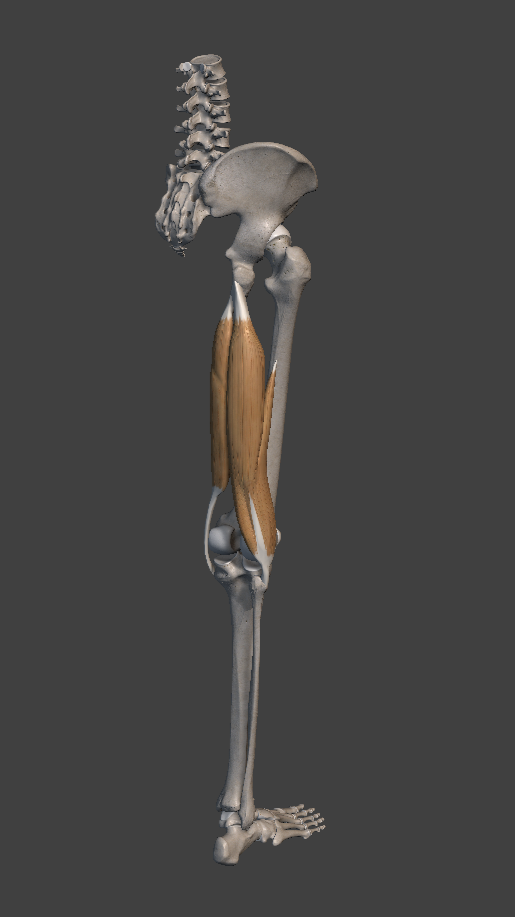 The quadriceps are a bundle of four muscles with similar purposes that almost always act together with one common goal: extending the knee and straightening the leg. During the motion we are analyzing, the leg doesn't actually extend, but the quadriceps are nonetheless very active in eccentrically contracting to restrain the amount of knee flexion.