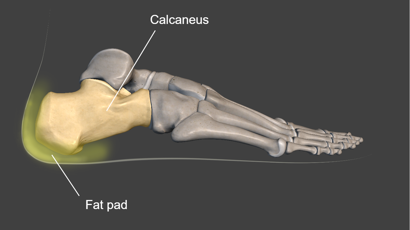 On the passive group, starting posteriorly, we begin cushioning the body from the heel strike and the calcaneal fat pads we find at this extremity of the foot. These pads provide the first impact cushion at a moment where all the force and weight of the body would hit an otherwise narrow surface and would put a lot of stress on the calcaneal bone.