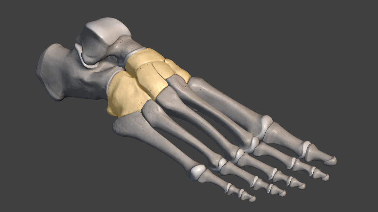 Moving slightly anteriorly, and next on the list, we find a series of flat, gliding joints. These types of joints generally are not the most mobile, but they allow for some drifting (as the name "gliding" suggests). This flexibility spreads slightly across the joints on contact to absorb some of the weight of the body. On top of that, the small gliding brings a layer of adaptability to the sometimes uneven terrain the foot is stepping on.