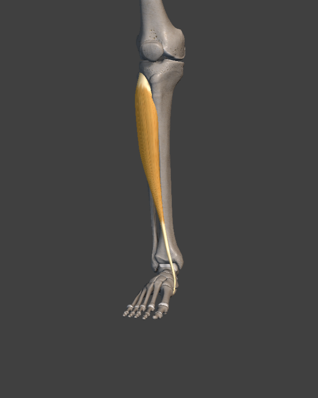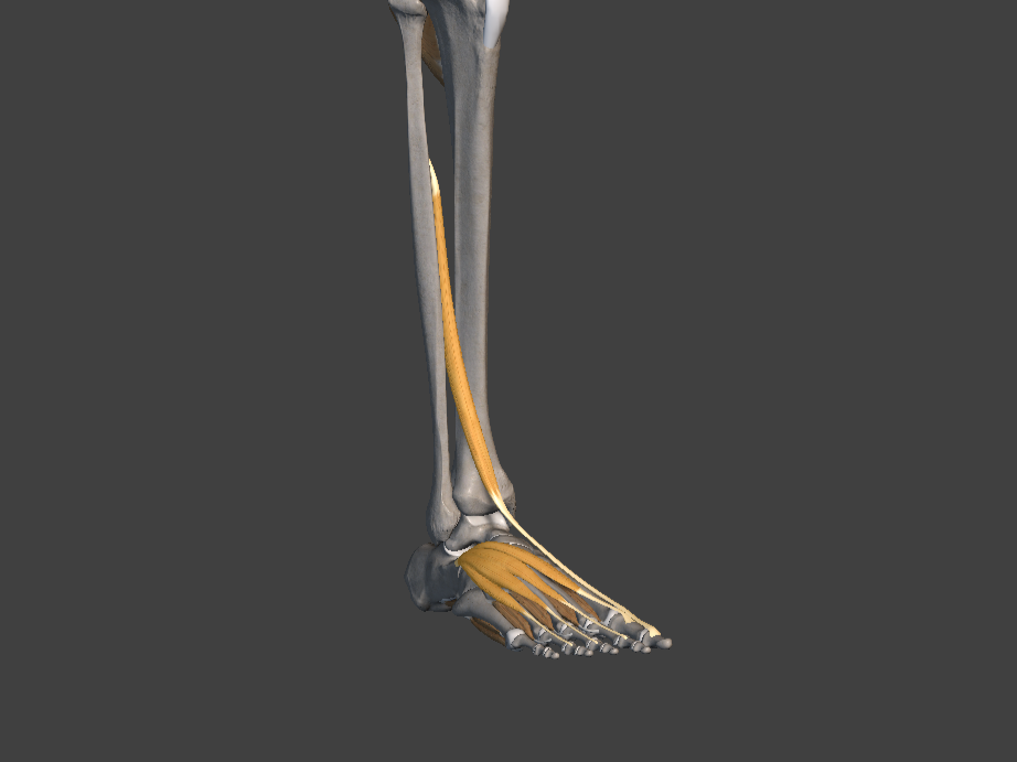 Extensor digitorum: connects from just under the knee to the top part of the toes. It is the muscle generally responsible for bending our toes upward.